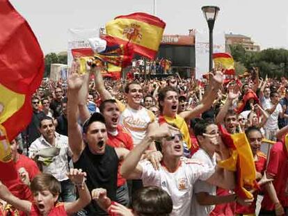 Aficionados españoles apoyan a la selección de fútbol en la plaza de Colón