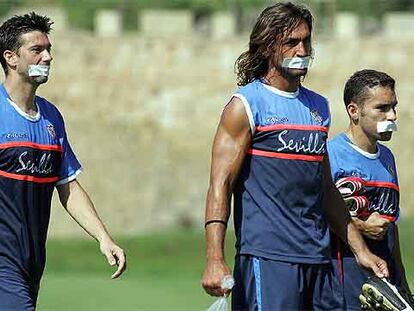 Los capitanes del Sevilla con un esparadrapo en la boca