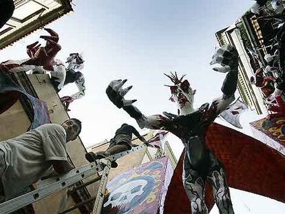 Preparación de uno de los desfiles en las fiestas del Barrio de Gràcia en 2005