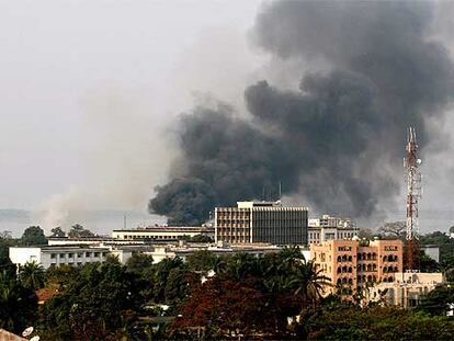 Una columna de humo en un edificio de Kinshasa, Congo