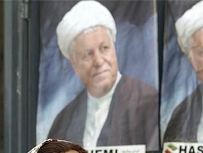 Una mujer fuma ante un cartel electoral de Rafsanyani