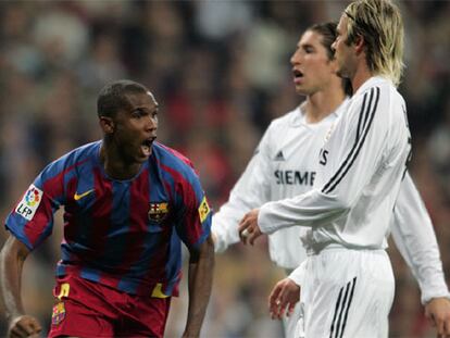 Eto'o celebra el gol de la la pasada temporada en el Bernabéu