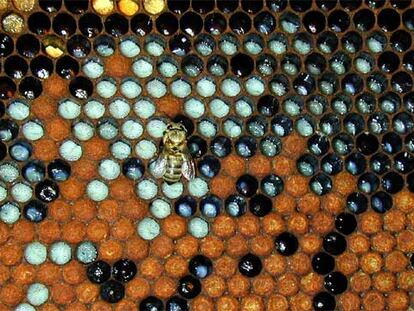 Una abeja de la miel, <i>apis mellifera</i>, cuidando su colmena