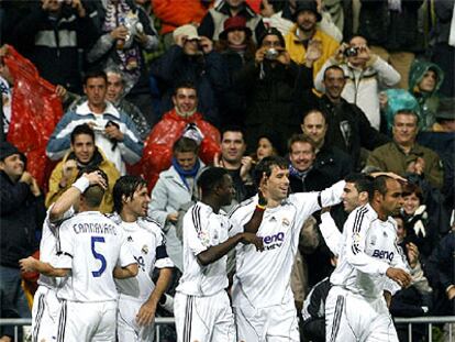 Los jugadores del Real Madrid se abrazan tras el gol ante el Racing de Santander