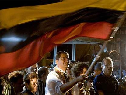 Rafael Correa ondea la bandera de Ecuador, en Guayaquil, tras su victoria en las presidenciales