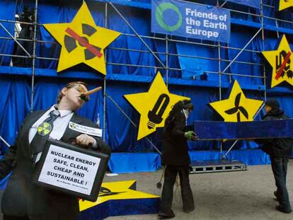 Unos manifestantes despliegan una pancarta en favor de las energías verdes