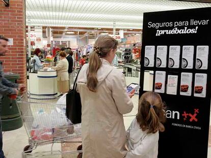 Caja Navarra ha puesto a la venta, a las puertas de un hipermercado de Pamplona, seguros de salud, accidentes y retirada del carné de conducir literalmente 'enlatados'.