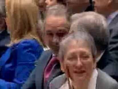 La recién elegida Presidenta de la Comunidad de Madrid se ha emocionado, durante su discurso, al expresar el especial agradecimiento al apoyo recibido de su familia