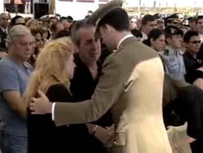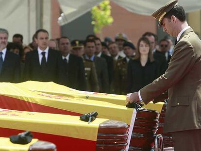 Los Príncipes de Asturias acompañados por el presidente del Gobierno, José Luis Rodríguez Zapatero, el ministro de Defensa, José Antonio Alonso, y otras autoridades han dado su último adiós a los soldados en Paracuellos del Jarama.