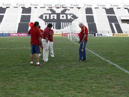 Luis Aragonés y sus ayudantes examinan el estado del césped del estadio Toumba