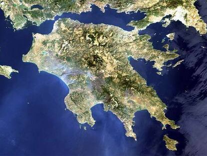 Una imagen áerea tomada hoy por el satélite Envisat muestra las zonas devastadas por los incendios en la península del Peloponeso