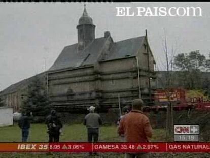La histórica iglesia de Heuersdorf inició hoy su mudanza desde esta localidad de Sajonia (este de Alemania) a la localidad vecina de Borna, a 12 kilómetros. Una corte determinó que los 300 residentes deben abandonar la localidad para permitir que mineros exploten el carbón situado debajo de sus hogares, en el este de Alemania. El templo pesa 1.000 toneladas.