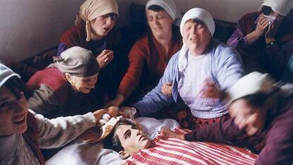 Mujeres albanokosovares lloran la muerte de un familiar