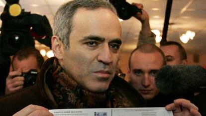Gari Kaspárov muestra una papeleta tachada en señal de protesta