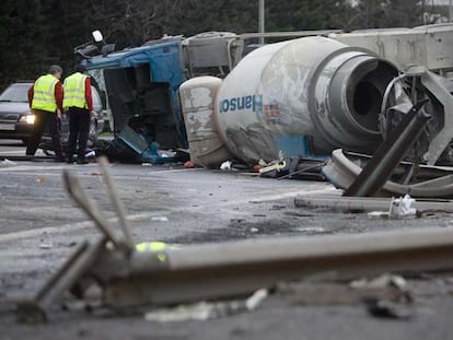 Estado en que quedó el camión hormigonera tras el accidente mortal del pasado lunes en la A-8