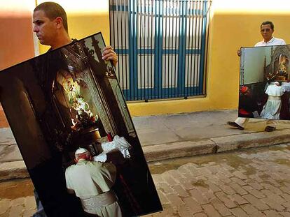 Dos obreros cubanos transportan fotografías, tomadas hace diez años, del fallecido papa Juan Pablo II, en La Habana Vieja