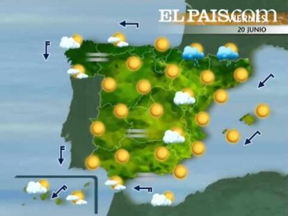 Este viernes las nubes se quedarán de nuevo en las regiones del norte, donde alternarán con claros y podrían dejar algún chubasco débil durante la tarde. Pero en el resto del territorio, incluidos los archipiélagos, el sol reinará en un cielo abierto y prácticamente despejado. Temperaturas muy veraniegas, con máximas que rozarán los 35 grados en el interior y en el sur. Mañana, más calor aún, tanto, que podría ser el día más caluroso del año hasta el momento.Para el domingo, más de lo mismo: calor en todo el país. En la zona del Valle del Guadalquivir y el Valle del Ebro, se registrarán las temperaturas de 40 grados.