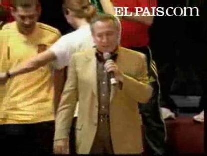 El cantante Manolo Escobar ha puesto el punto y final a la celebración por la victoria en la Eurocopa. Aragonés y sus jugadores han cantado con él "Qué viva España"
