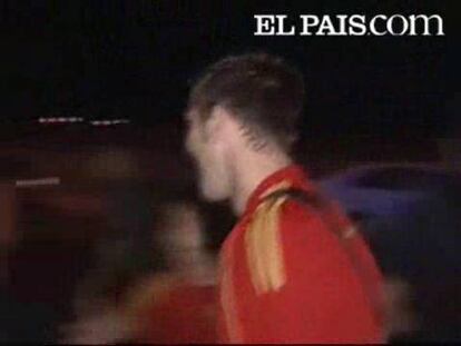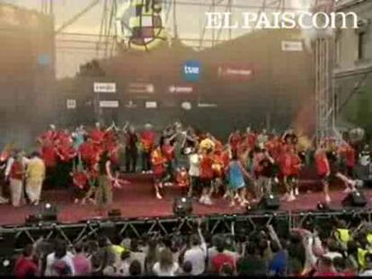 Los jugadores de la selección han celebrado por todo lo grande el título europeo en el escenario habilitado en la plaza de Colón, han llegado incluso a mantear a Luis Aragonés que ha sido uno de los protagonistas de la fiesta ya que se ha animado a cantar y saltar