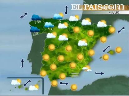 El viernes, la llegada de un nuevo sistema frontal a las costas gallegas hará que regresen las lluvias a esta comunidad, a puntos dispersos del Cantábrico occidental y del noroeste de Castilla y León. La jornada volverá a presentarse soleada, con predominio de cielos despejados o prácticamente despejados en el resto del territorio peninsular. El sol será el protagonista también en las Baleares. En Canarias algunas nubes alternarán con los claros. Las temperaturas, en ascenso en toda la península. El sábado, los cielos permanecerán muy nubosos o cubiertos en todo el tercio norte peninsular aunque, los chubascos se quedarán únicamente en las regiones del Cantábrico oriental y en el área Pirenaica. Algunas nubes podrán alternar con los claros, durante la tarde, en áreas elevadas del interior. En el resto de la península y, en ambos archipiélagos, los cielos permanecerán despejados. El domingo la situación será similar, si bien las nubes viajarán a Cataluña pudiendo dejar incluso chubascos tormentosos. Por el contrario, en Galicia, el tiempo mejorará. El resto de la península se mantendrá estable, en un día agradable y veraniego.