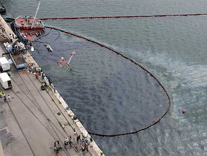 La gabarra 'Savinosa', rodeada de manchas de fuel
