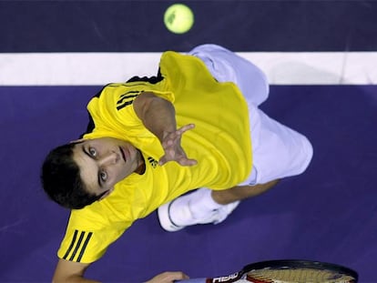 Simon saca durante el partido contra Nadal