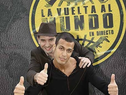 Álvaro Pérez enseña su moto a un amigo frente a la sede del PP de Valencia