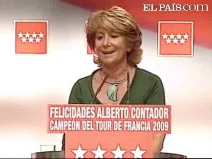 El ciclista obsequia a la presidenta de la Comunidad de Madrid con el maillot amarillo