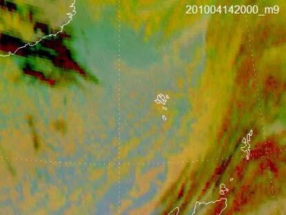 La imagen captada por el satélite Meteosat 9 muestra cómo la nube se forma a partir del volcán situado bajo el glaciar del Ejyafjalla, al sur de Islandia. Al principio, la nube presenta un color negro, debido a que las partículas de hielo enmascaran la ceniza. Poco a poco, la nube adquiere tonos rojizos, lo que indica la presencia de ceniza volcánica.