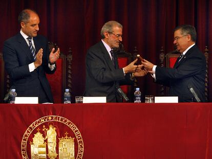 Morcillo toma el bastón de la Universitat de València de manos de Tomás.