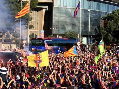 Aficionados reciben al autobús del Barça en el Camp Nou