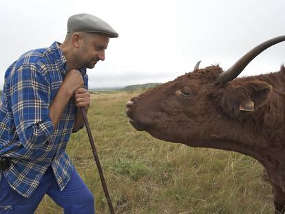 El ganadero Roberto Álvarez, con una vaca de la raza salers