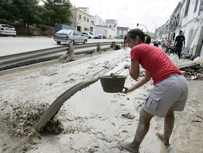 Una mujer retira el barro de su vivienda