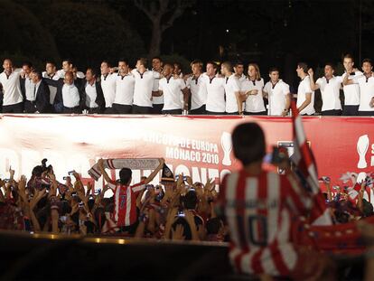 Los jugadores y el cuerpo técnico del Atlético celebran el título en Neptuno