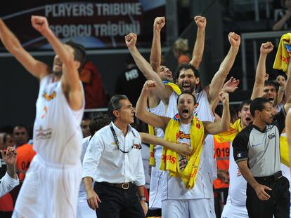 El banquillo celebra la victoria de España sobre Grecia en el Mundial de baloncesto