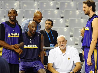 Phil Jackson, rodeado por Kobe Bryant, Lamar Odom y Pau Gasol