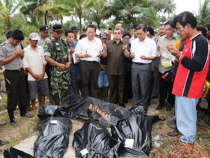 El vicepresidente indonesio (cuarto por la derecha) reza ante víctimas