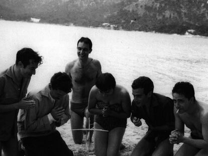 Un receso de las Conversaciones Literarias de Formentor, de izquierda a derecha: Juan Goytisolo, una persona sin identificar, Italo Calvino, Monique Lange, Luis Goytisolo y Jesús López Pacheco.