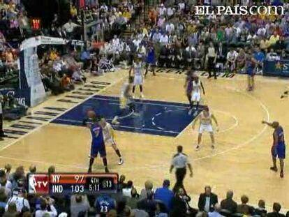 Carmelo Anthony anotó 34 puntos, incluida la canasta que marcó el triunfo cuando restaban 4.9 segundos para el final del partido y que llevó a los New York Knicks a una victoria por 109-110 sobre los Pacers de Indiana. Es el séptimo triunfo consecutivo de los Knicks.
