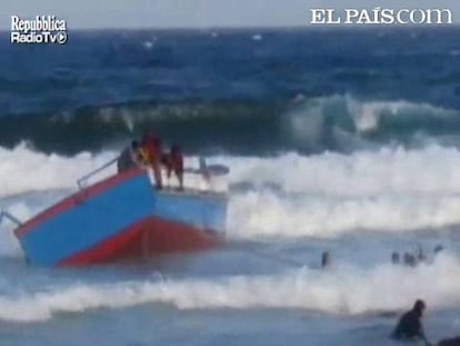 Dramático vídeo del rescate de los inmigrantes norteafricanos que llegaban a la isla italiana de Pantelleria a bordo de un barco pesquero que encalló en las rocas en mita de las olas.