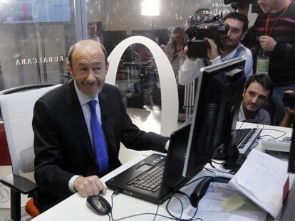 El candidato del PSOE responde con esfuerzo en nueve segundos en una entrevista 'twitcam' "Esa noche no me iré", promete el candidato a la pregunta de si dimitiría como Almunia Sobre a quién prefiere, Zapatero o González: “Es como a quién quieres más, a mamá o a papá”