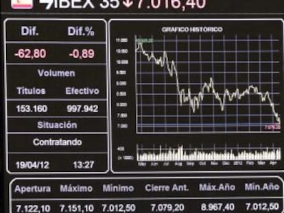 El Ibex prolonga las fuertes caídas y cierra con un descenso del 2,42%, hasta los 6.908 puntos La presión contra España también hace subir la prima de riesgo hasta superar los 420 puntos