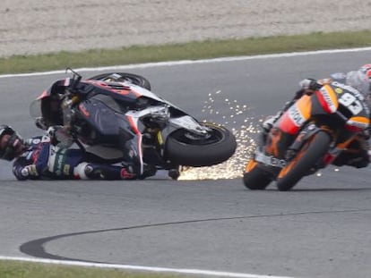 Un choque entre ambos en los compases finales de la carrera de Moto2 en Montmeló terminó con el primero en el suelo y con un esguince de tobillo