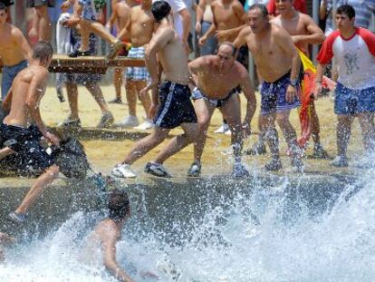 Una vez el toro está en el agua, los participantes lo empujan hacia una rampa para que pueda salir