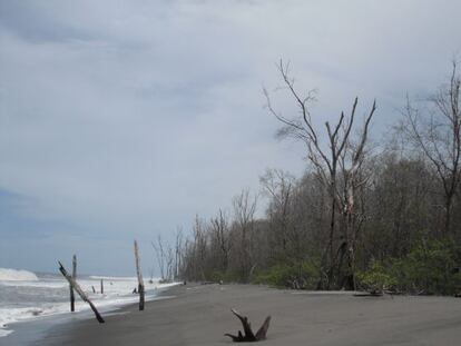 El aumento del nivel del océano, debido aparentemente al cambio climático, se está comiendo parte del litoral de El Salvador, incluso un bosque de manglares