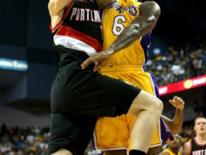 El alero, duodécimo español en la NBA, firma 3 puntos, 1 rebote y 1 tapón en el duelo preparatorio de Portland contra los Lakers (93-75), aún sin Bryant ni Howard