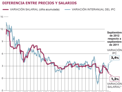 Los salarios pactados en convenios crecieron un 1,3% hasta septiembre En el mismo mes los precios crecen un 3,4%