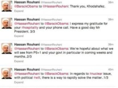 El presidente iraní publica en su perfil de Twitter detalles de su conversación con Obama Los mensajes que hablaban sobre el tema nuclear iraní o Siria fueron rápidamente borrados