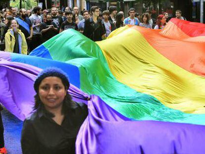Las banderas arcoíris rodean al lema "Aquí ni dios es normal" en el recorrido por las calles de Bilbao