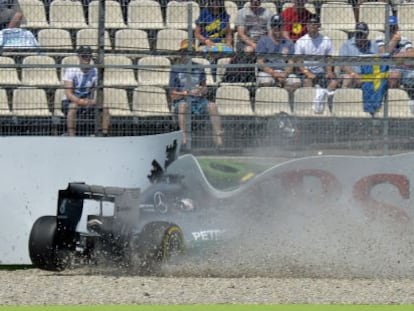 Tras estrellarse, Hamilton maldice el problema en los frenos de su coche, distintos a los de Rosberg
